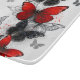 Un troupeau de papillons de morpho volants, réalistes, rouges et noirs sur un arrière - plan blanc avec des gouttes de peinture.
