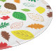 Cette planche à découper ronde est équipée d'un motif automnal avec des feuilles dans les tons jaune, orange, rouge et marron.