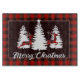Two plaid reindeer flank a trio of white pine trees beneath a glowing star, framed in red and black buffalo plaid. A snowy black backdrop and elegant “Merry Christmas” script complete this festive tableau, blending rustic charm with holiday magic.