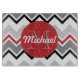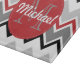Cette conception de chevron dans les tons de rouge, du gris et du noir a un cercle rouge avec le motif blanc de point. Personnaliser avec votre nom et initiale. Une conception contemporaine qui éclairera vers le haut de jour de toute personne.