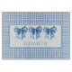 Cette mignonne planche à découper en verre personnalisée est dotée d'un arrière - plan en vichy bleu et blanc préppy avec des arcs bleus assortis. Personnalisez avec votre choix de nom ou de texte spécial. Fait un grand cadeau pour les premiers appartements et les nouvelles maisons.