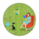 Cette Retro Reading Woman Cutting Board présente un style années 60, art minimaliste, dessin animé d'une femme qui a ses priorités dans l'ordre. Ce délicieux ver de livres est entrainé dans un vrai tourneur de page. La brunette, toute en forme, porte une robe d'aqua et des lunettes rouges, tout en tenant un livre bleu. Elle est assise dans une chaise confortable aux oeufs rouges. Devant elle, un chat noir élégant dans un col turquoise profite de la tranquillité qui vient de vivre avec un bibliophile. Femme et chat sont tous deux dans une élégante chambre verte. Au-dessus, une lampe pendentif kitsch dans les tons jaune et turquoise. Sur le côté, un plante luxuriant, tropical, en pots, est installé dans un aqua fleuri. Kitty, si vous avez besoin de quelque chose, vous devrez attendre jusqu'à ce qu'elle finisse ce chapitre !