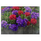 Cette planche à découper présente des fleurs rouges et violettes dans un tonneau de vin