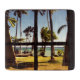 Scène de plage tropicale Fiji Beach - Photo d'une plage aux Fidji avec palmiers, hamacs et banc de pique-nique vu à travers les volets ouverts d'une cabane de plage. © Alan Harman Photography 2004. Tous droits réservés. www.alanharmanphotography.com 120418 planche à découper