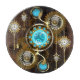 Turquoise lenses with antique watch with brass gears and golden keys on rusty, brown background. Steampunk style.