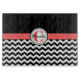 Une planche à découper personnalisée avec un motif chevron noir et blanc. Vous pouvez personnaliser ce produit en ajoutant votre propre nom et votre initiale au centre du logo monogramme.