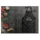 Cette planche à découper Black Apron d'apparence professionnelle est parfaite pour toute personne qui aime cuisiner, cuire ou barbecue. Un tablier noir professionnel sur un arrière - plan noir avec des articles de cuisine partout.