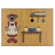 Ours tourbillon habillé d'une robe rouge avec un col blanc feuilleté, un bandeau assorti et un tablier blanc avec des coeurs sur les poches. Elle se tient à côté de sa table à pâtisserie, avec un bol et quelques bombes d'ingrédients. Une étagère accrochée au mur contient des bombes et divers ustensiles accrochés à l'étagère. L'Arrière - plan est un look de grain de bois.