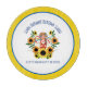 Une planche à découper colorée présente une fille ukrainienne style art populaire centre en costume traditionnel avec de grandes fleurs de soleil et le salut national "Gloire à l'Ukraine! Gloire aux héros !" en anglais et en ukrainien. Bordures bleues et jaunes du drapeau ukrainien