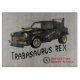 Une image d'une voiture Trabant Est Allemande customisée générée par ordinateur, noir et or. Le surnom de la voiture customisée, Trabasaurus rex, dans une police appropriée, apparaît à la fois sur la porte du véhicule et sous l'image. Le véhicule porte une plaque d'immatriculation Idaho listant "TRABI REX" comme il a été customisé par la mythique Warsaw Pacte Wonder Wheels (Classic Commie Cars) à Sandpoint. Le logo des Wonder Wheels du Pacte de Varsovie apparaît également. Le Trabant était la voiture du peuple de l'Allemagne de l'Est "Trabant" signifie compagnon de voyage et a été inspiré par le mot russe "Spoutnik" avec la même signification. Plus de 3 millions de Trabants ont été produits en l'espace de 30 ans. Le moteur de Trabant était sous-alimenté, inefficace et créait beaucoup de pollution. Le Trabant, ou Trabi, si décrié qu'on l'appelait communément, est depuis longtemps la cible de plaisanteries, mais est devenu tendance ces dernières années. Certains ont été importés aux États-Unis. Le toit, le couvercle de coffre, le capot, les défenses et les portes ont été construits avec Duroplast, un plastique dur semblable à Bakelite, fait de matériaux recyclés : les déchets de coton de l'Union Soviétique et les résines phénoliques de l'industrie des teintures d'Allemagne de l'Est. Cela a fait du Trabant la première voiture avec un corps en matériau recyclé et était en partie responsable de l'idée fausse qu'il était fait de carton. Divers résultats d'essais de collision ont montré qu'il s'est mieux comporté que les hatchbacks occidentaux contemporains comparables.