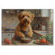 Add a warm and cheerful vibe to your kitchen with this Wheaten Terrier design featuring a friendly pup cooking in a cozy setting. With its soft wheaten coat and joyful personality, this artwork brings a welcoming and heartwarming feel to any space.