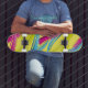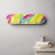 Ce skateboard de qualité est présenté dans une couleur solide de jaune avec une impression colorée d'ondes. Acheter tel quel ou customiser cet objet à votre goût.
