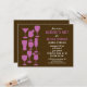 Célébrez la future mariée avec style. Une variété de cocktails, de bières et de verres à vin dans la silhouette violette brillante contre un riche arrière - plan brun rayé de colonnes de points blancs pour faire un effet pluvieux. Votre texte customisé se distingue en violet et blanc avec d'autres informations optionnelles imprimées sur le dos. Disponible en couleurs alternatives.