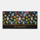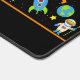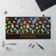 Un tapis de bureau extérieur coloré amusant. Le design présente des astronautes de bande dessinée amusants, des fusées, des aliens. étoiles, lune et planètes sur un arrière - plan photographique noir à voie laiteuse. Personnalisez en modifiant le nom. Une façon parfaite d'ajouter de la couleur et du plaisir au bureau d'un enfant.