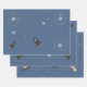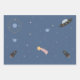Un papier d'enveloppement à thème spatial avec planètes, étoiles, soucoupes volantes, étoiles tournantes et roquettes en dessin animé sur un arrière - plan bleu. Ce pourrait être une bonne idée pour envelopper des cadeaux pour un enfant ou un amoureux de l'espace et des galaxies !