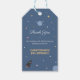 Une étiquette de remerciement de fête d'anniversaire sur le thème de l'espace avec des planètes, des étoiles et une fusée en style cartoon sur fond bleu. Vous pouvez facilement l'utiliser pour remercier les invités d'une fête ou pour tout cadeau que vous réaliserez !