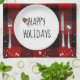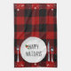 Snowman sur Happy Holidays texte sur plaque blanche et argenterie avec buffle rouge et noir plaid arrière - plan et flocons de neige