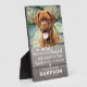 Plaque commémorative personnalisée pour animal de compagnie avec une photo de votre animal de compagnie bien-aimé dans un cadre légèrement flou, un fond en bois rustique gris tendance et une citation de sympathie qui dit "vous avez souri avec vos yeux, ri avec votre queue et aimé de tout votre cœur", une empreinte de patte, un cœur, le nom de votre chien et les dates. Un beau souvenir et un hommage à votre précieux chien ou chat de compagnie.