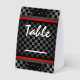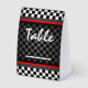 Auto Racing Checkered Design Tent-Style Paper Table Sign with customizable text on both sides. Fill in your own Table Numbers. Note: Each order consists of 10 identical signs, thus, fill in your own table numbers.