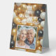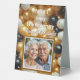 Panneau de numéro de table Joyeux Anniversaire pour les tables pour une fête d'anniversaire de 50 ans. Graphiques de ballons et de confettis noirs et dorés avec un espace pour mettre votre message personnalisé et une photo du couple.