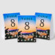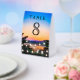 Elegant table number card featuring modern typography against a romantic sunset background.