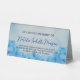 Panneau de tente pour la table de carte mémoire lors d'une fête de la vie avec le nom de votre être cher dans un script bleu et de jolies hydrangées bleues.