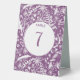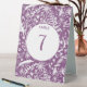 Jolies et élégantes silhouettes botaniques florales de la nature, feuillage blanc, feuilles et fleurs sur un arrière - plan violet. Coordonner la carte de numéro de table recto verso avec le texte qui peut être modifié en fonction de votre célébration.