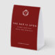 Add a charming and elegant touch to your wedding tables with this burgundy wedding bar table tent. Featuring a rich burgundy background and crisp white typography, this design showcases a classic crest with the couple’s stacked initials at the top. Centered below, the sign reads “The Bar Is Open” with the romantic phrase “Cheers to Love”, creating a timeless, sophisticated accent for your reception tables.