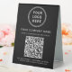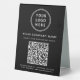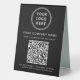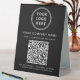 Drive instant engagement at your counter, table, or reception area with this custom QR code table tent sign. Designed with a clean black background, modern white typography, and space for your logo and business name, this professional tabletop display makes it easy for customers to access your services, pricing, or website in seconds. The scannable QR code offers a seamless, contactless experience -- perfect for restaurants, cafés, salons, retail shops, medical and dental offices, hotels, events, and pop-ups. Simply enter your website or link, and Zazzle automatically generates the QR code for you. Use it to share menus, service lists, booking pages, promotions, or important business information without printed handouts. Sturdy and freestanding, this table tent sign enhances your brand visibility while keeping your space uncluttered and on-trend.