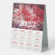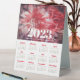 Affichez ce calendrier de style tente de table recto verso où vous ou vos clients et clients avez besoin de voir un calendrier annuel en un coup d'oeil. Chaque mois est en rouge et vos informations d'affaires et année 2023 sont présentées sur une impression florale aquarelle au sommet.
