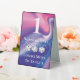 Une façon amusante et moderne de guider les joueurs de Bunco de table en table. Arrière - plan holographique rose et violet. Trois dés Bunco ou Bunko de chance blanc. Les gagnants restent et les perdants passent au tableau 3.