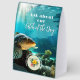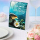 Seafood restaurant table tent sign for "catch of the day". One side, with grouper under the sea background, contains a template for this text. Include the business logo at the bottom, with curved text around it. Sample wording is "fresh and sustainable local seafood". On side two, customize text for Happy Hour offerings. An octopus under the sea is the background image. Use the design tool to make further changes as needed for your establishment. Paper tent signs come in two sizes.