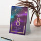 Celestial Purple Teal Gold Sun Moon Astronomy Wedding Table Numbers Paper Table Tent Sign features gold sun, moon and stars with a golden frame on colorful celestial purple, teal and blue cosmic background. Inside is your custom table number information. Designed for you by Evco Studio www.zazzle.com/store/evcostudio