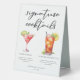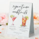 Ce panneau de tente de table à cocktails sophistiqué présente une typographie noire simple au-dessus de 2 de vos boissons préférées et de leurs ingrédients pour votre bar mariage côtier. Un dessin chic cosmopolite et Long Island Iced Tea ajoutent une touche amusante à votre menu du bar. Complétez avec les noms du couple et la date de leur réception.