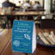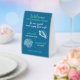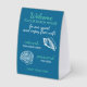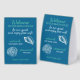This modern and stylish paper table tent sign features the message: "Welcome to our beach house! Be our guest and enjoy free Wi-Fi. Network: [insert network name] - Password: [insert password]. Enjoy your stay!" The text is displayed in aqua turquoise green and white against a matching teal blue. The sign can also be personalized or customized with your own message. It's a simple and welcoming way to inform your vacation rental guests about the internet login details.