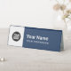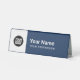 Easily personalize this Custom Employee Name Table Tent with Logo with name, profession, job title and business logo. A simple business design in navy blue and white colors fully customizable, sans-serif basic and modern fonts and a professional and clear look. Available in plastic or paper. Background color and fonts are totally customizable. No minimum order.