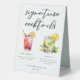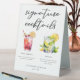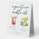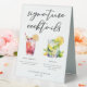 This chic signature cocktails menu table tent sign features custom black typography above 2 drinks and their ingredients for your wedding bar. A cute Dirty Shirley Temple and Mojito drawing add a cool flair to your bar menu. Complete with the couple's names and date for their reception.