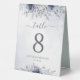 Élégant panneau de tente moderne à mariage floral numéro de table avec fleurs d'aquarelle bleu poussiéreux avec calligraphie manuscrite.