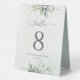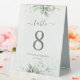 De beaux numéros de table mariage avec des eucalyptus aquarelles et des feuilles d'or.