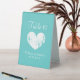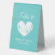 Elégante tente bleu turquoise pour mariage. Décor chic de table pour aider les clients à trouver leur place à la réception. Coeur vintage blanc avec typographie classe. Joli design pour les couples qui se marient. Personnalisez ce modèle avec vos propres nom et date. Exemple : Tiffany & James.