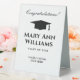 Élégant panneau supérieur de table pour la fête de remise des diplômes. Personnalisez avec le nom personnalisé et l'année de classe. Logo de casquette de goût académique avec typographie classe. Idéal pour signer des livres d'invités, laisser des cadeaux, des notes, etc. Impression recto verso.