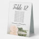 Ces panneaux de numéro de table de tente ne sont pas seulement beaux, ils incluent même une liste de noms pour les invités à chaque table, ce qui permet à vos invités de trouver facilement leur siège à votre réception de mariage. Le design est à la fois élégant et romantique avec un seul rose couleur pêche sépia allongé sur son côté réfléchissant dans l'eau avec des vagues et des ondulations. Le titre est en calligraphie de script en dentelle avec des chiffres en gras afin que vos invités puissent facilement trouver la bonne table. Il y a de la place pour les noms du couple et la date du mariage.