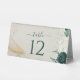 The rich emerald green background provides a sophisticated contrast to the soft floral details, creating an elegant look for your guest tables. These foldable table signs are fully customizable; easily edit the table numbers, guest names, or meal choices to suit your needs.