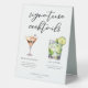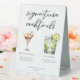 Cette carte de cocktails chic et signature propose une tyopgraphie noire simple au-dessus de 2 boissons et leurs ingrédients pour votre bar mariage. Un expresso martini, un gin tonique et un dessin à base d'espresso ajoutent une touche cool à votre panneau de tente de table de bar. Complétez avec les noms du couple et la date de leur réception.