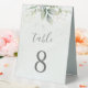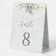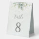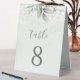 Beaux numéros de table de mariage avec eucalyptus aquarelle et feuilles dorées.