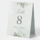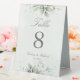De beaux numéros de table mariage avec des eucalyptus aquarelles et des feuilles d'or.