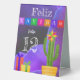 Feliz Navidad Fiesta design avec un cactus vert vif décoré d'un ornement de Noël mexicain sur le dessus et des boîtes cadeaux colorées. Porte le mot NAVIDAD sur papel picado (violet, bleu, vert, rose mexicain, orange, violet et rouge). C'est un design gai et lumineux sur une surface violet-violet. Célébrez votre fête de Noël mexicaine avec des couleurs festives et vives.