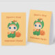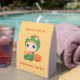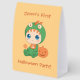 Adorable baby dressed in a green dragon costume with orange spikes and matching orange bib with a skull. A curved pumpkin stands just a little behind. Baby’s first Halloween party invitation, any gender.