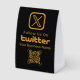 This elegant table tent sign features a bold gold "X" logo and "Follow Us On Twitter" text in a stylish gold font against a sleek black background. It also includes a prominent QR code, making it easy for customers to connect with your business on Twitter. Personalize it with your business name to create a cohesive brand experience. Perfect for restaurants, cafes, and retail spaces, this sign encourages social media engagement and expands your online reach. Its unique design is sure to catch the eye and prompt action from your patrons, enhancing your business's social media presence.