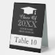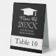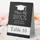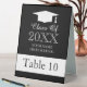 Dîner de fin d'études numéro de table signes de tente. Signes personnalisés. Décor de table classique pour les fêtes des diplômés. Aidez les gens à trouver rapidement leur table et leurs sièges. Design noir et blanc avec logo de goût. Décor et décoration chic des tables. Ajoutez votre propre nom de lycée personnalisé et année de classe.